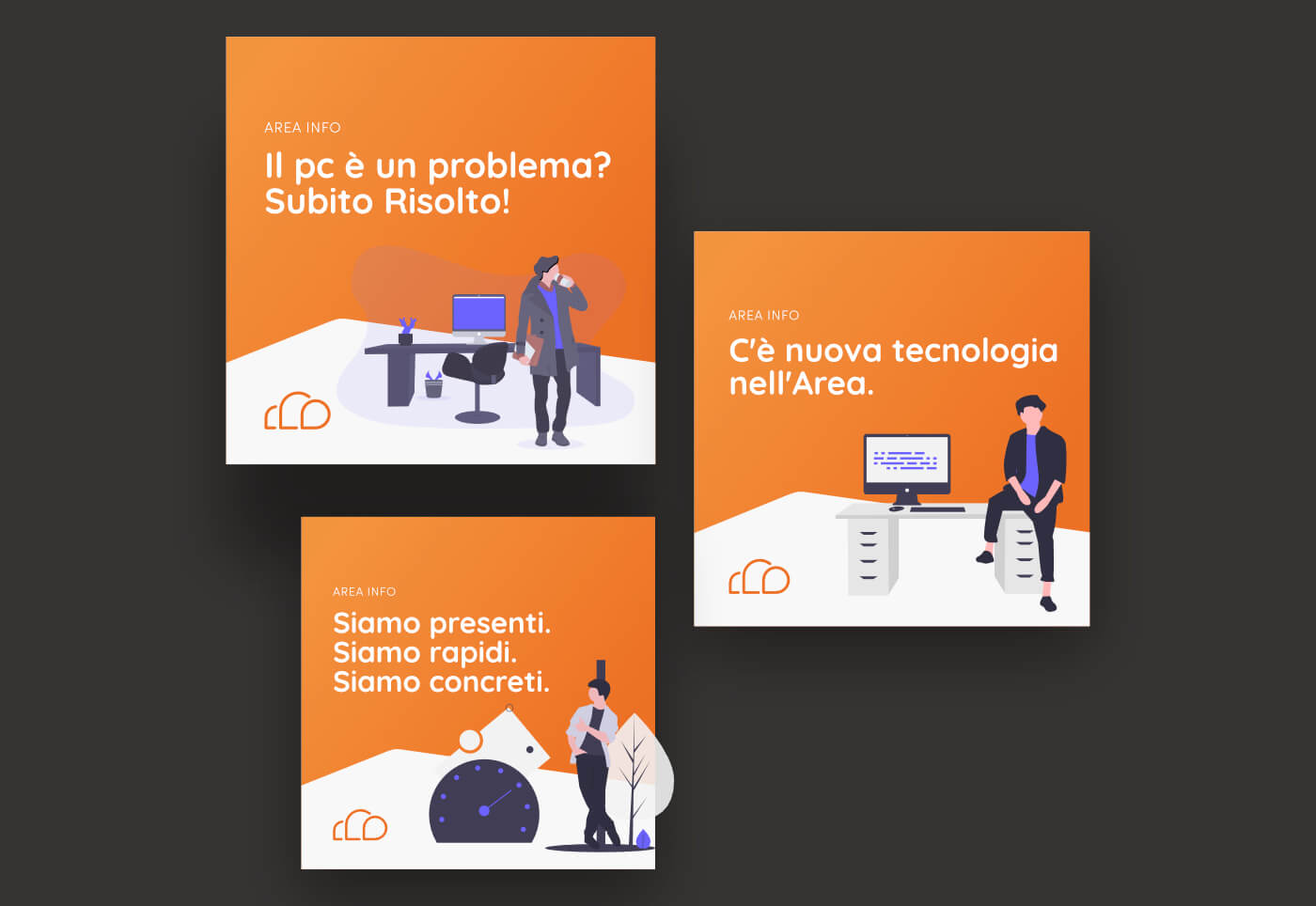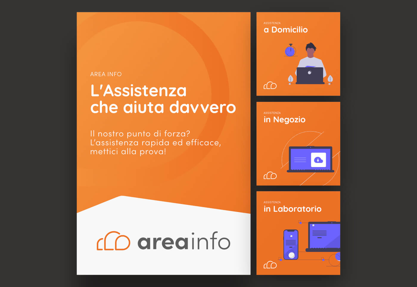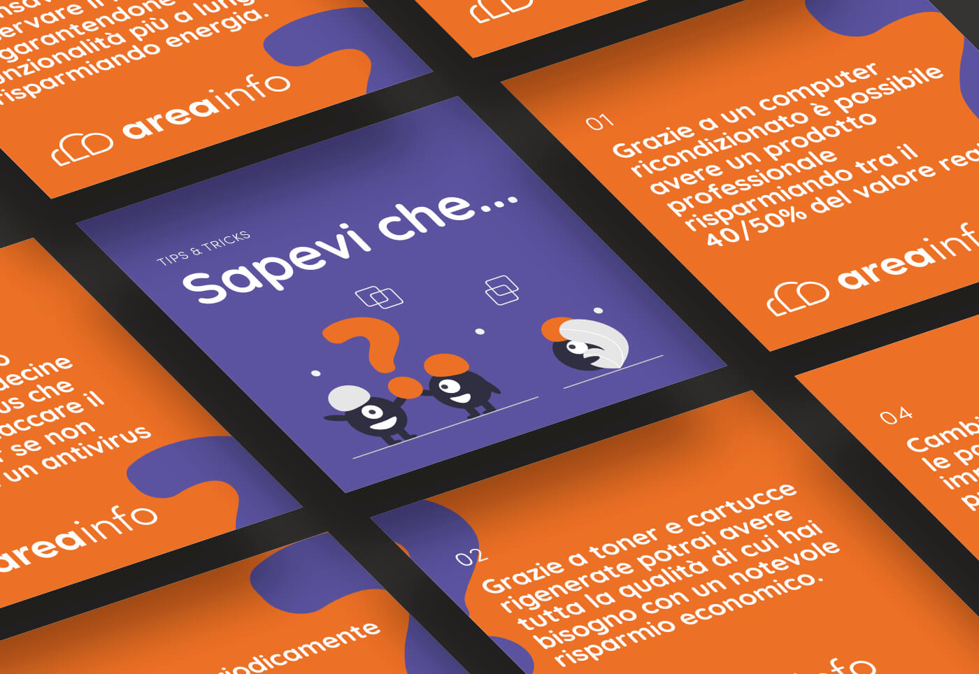 Per Area Info abbiamo sviluppato una comunicazione social coerente con l’identità visiva del brand. I post richiamano lo stile grafico del sito e parlano alle persone con un tono amichevole, semplice e rassicurante. Il messaggio è chiaro: hai un problema con la tecnologia? Non disperarti. Qualsiasi sia il tuo problema, ci pensiamo noi.