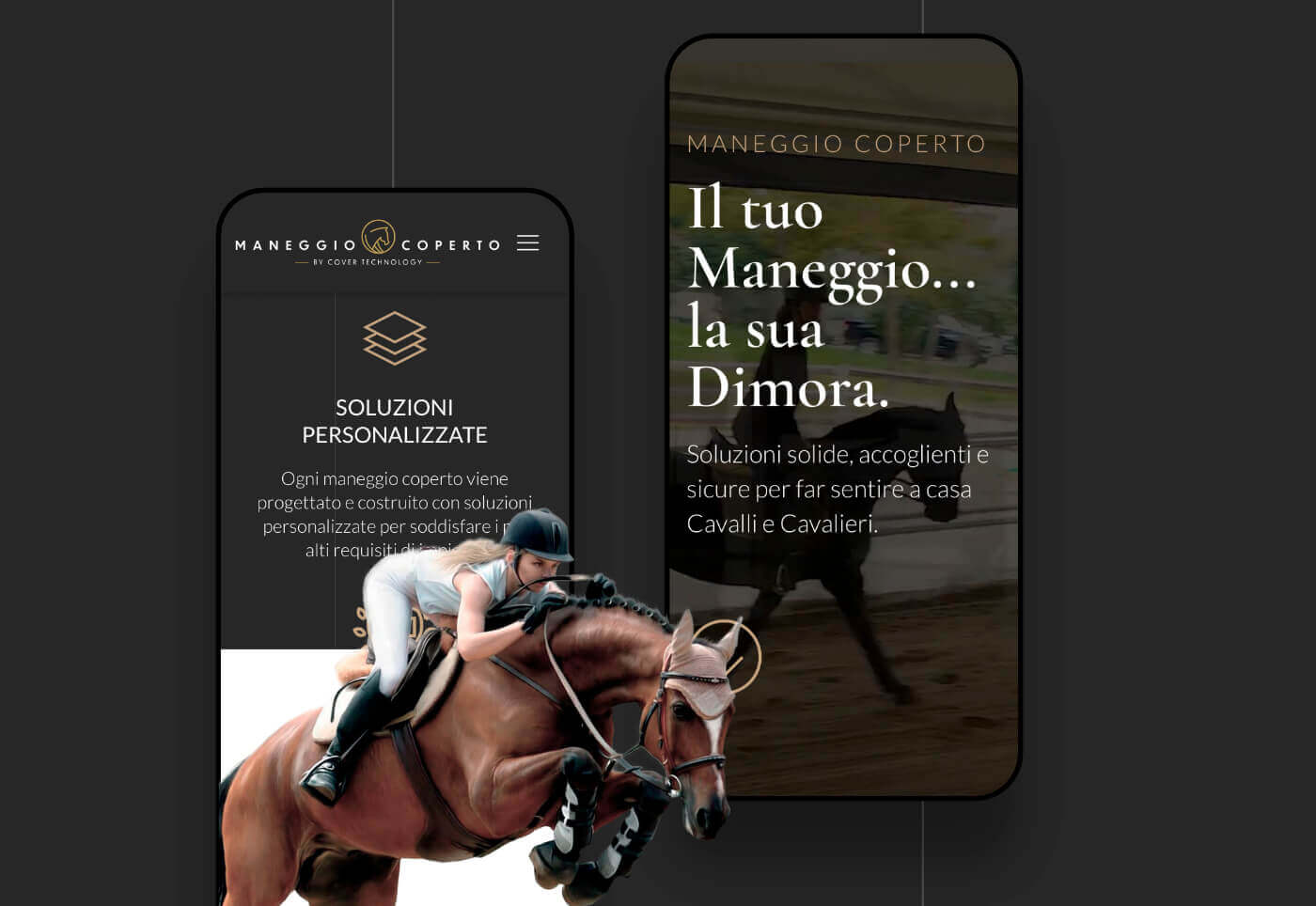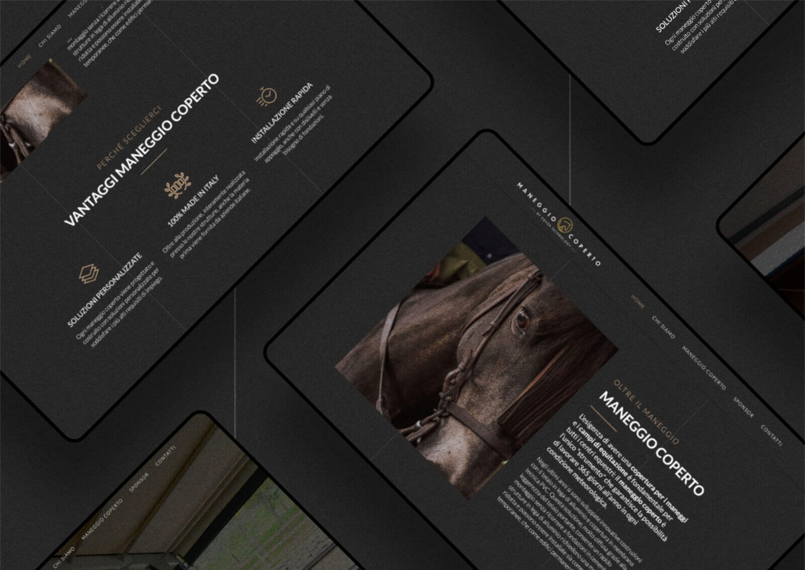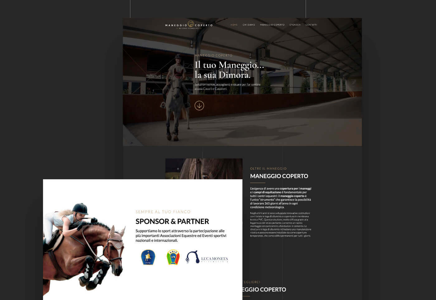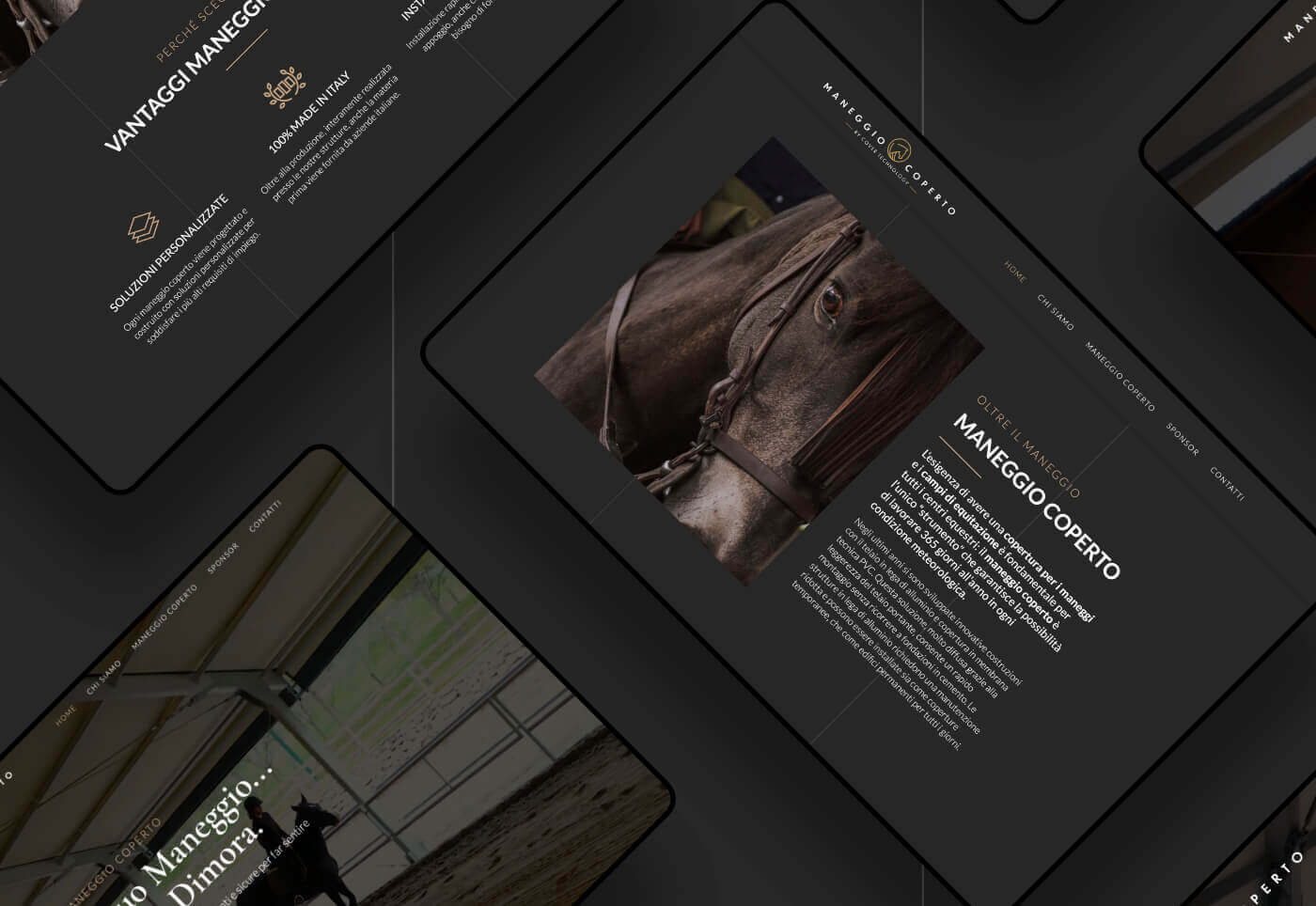 Il sito internet dedicato a Maneggio Coperto è stato realizzato per tutti coloro che, appassionati di cavalli, vogliono trovare una dimora solida e sicura in cui farli sentire a casa, accolti e coccolati in una struttura di qualità e valore. Il layout si fa notare per la particolarità dello sfondo nero alternato da linee verticali chiare: una sorta di signorile "gessatura" che, come un abito di gran classe creato su misura, veste con stile ed eleganza i contenuti. All'apertura si è accolti da un video con riprese effettuate all'interno di un maneggio costruito dall'azienda, nel quale traspare il forte legame tra Cavallo e Cavaliere. Nel sito internet oltre a informazioni dettagliate, curiosità, risposte a dubbi e domande, è possibile visionare numerose fotografie e video di maneggi realizzati dall'azienda.